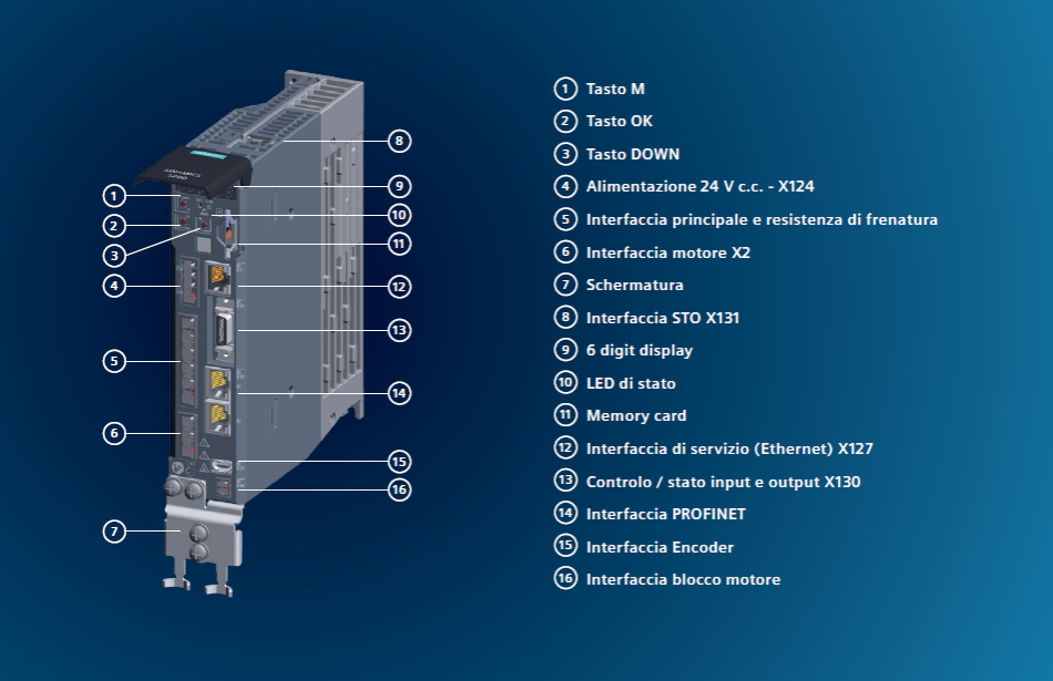 È pensato per la famiglia di motori SIMOTICS S 1FL2, con diverse inerzie e encoder digitali ad alta risoluzione (17 e 21 bit, anche multi-turn). I cablaggi consigliati sono i Motion Connect per posa fissa o mobile.
